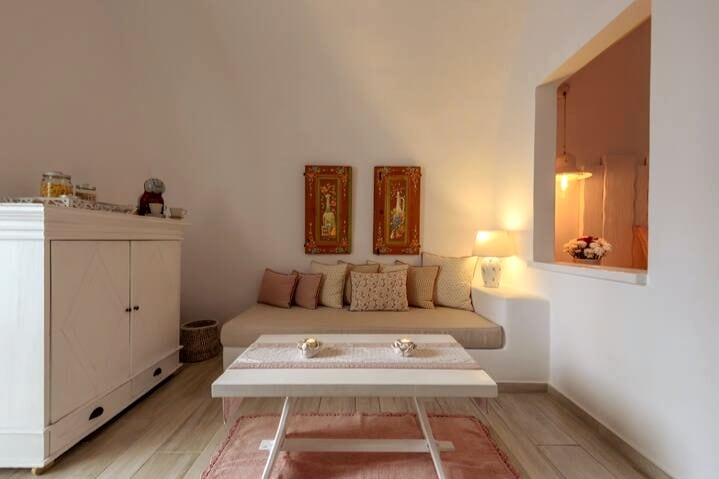 Queen Suite can easily accommodate 1 to 3 persons with one bedroom with double bed, one sofa bed for extra guest, all necessary equipment for making your morning coffee or tea, living room, bathroom with double shower, private furnished balcony and outdoor heated plunge pool with caldera and volcano view.Enjoy easy access to popular shops and restaurants from this charming place to stay.