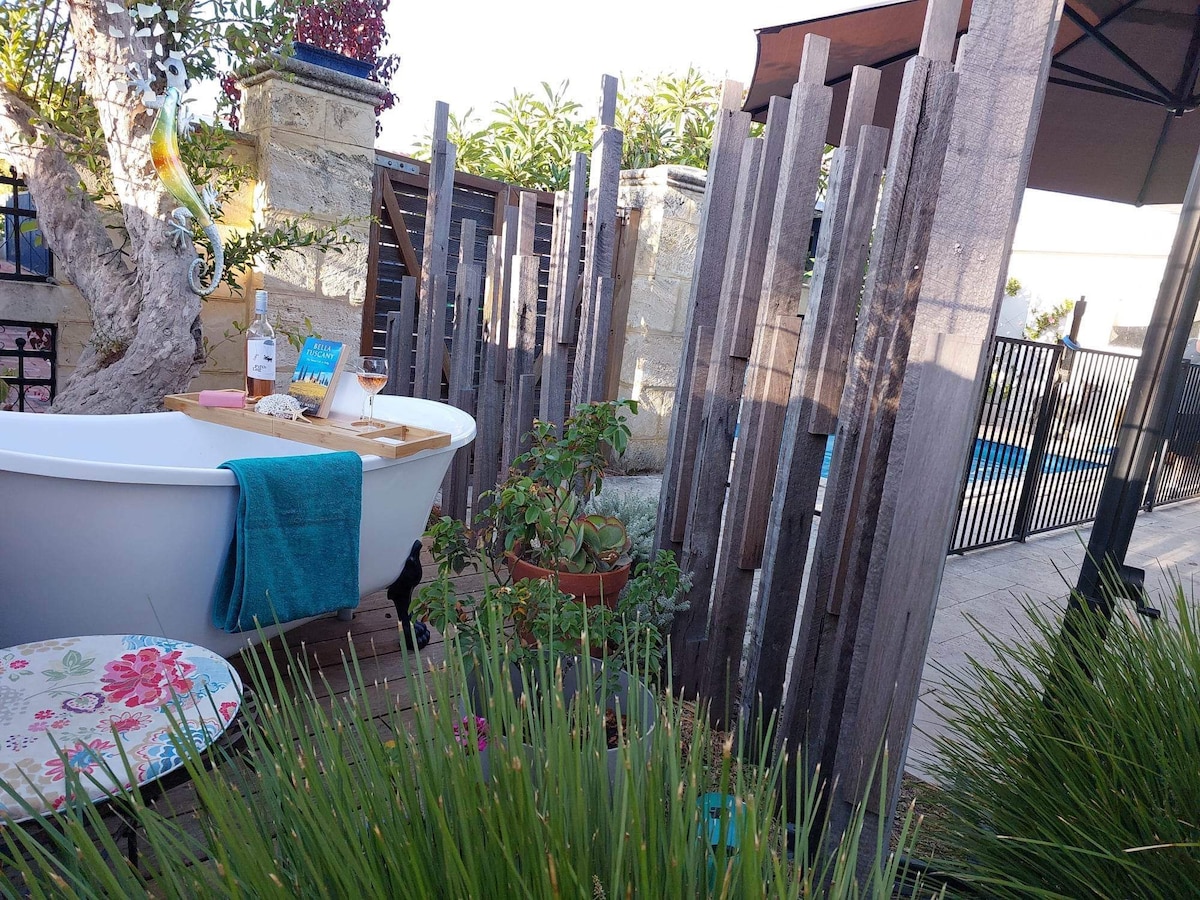 Peaceful and centrally located, Wild Grace Garden is nestled in the heart of everything that's good about South Freo. Take a 300m walk to beautiful South Beach, and find award winning bakeries, cafes, bars, restaurants and pubs even closer. Fremantle centre is a 20 min walk or 5 min drive. Plenty of public transport close by. 300m to Gourmet grocer and supermarket. After seeing the sights return home to a cup of herbal tea and a long leisurely outdoor bath.