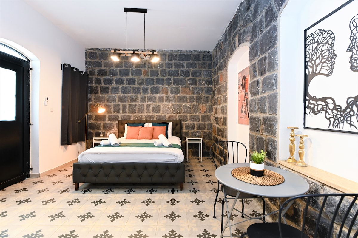 Welcome to Studio Apartment No. 8 in the "Bazelet Boutique" in Tiberias! This unique apartment is part of a complex with 7 distinct studio apartments, each uniquely designed, located on a quiet street, just a 5-minute walk from the city center and the Sea of Galilee. Ideal for couples or small families, it features a dining area, bathroom, and kitchenette. Only a minute’s walk to a synagogue.