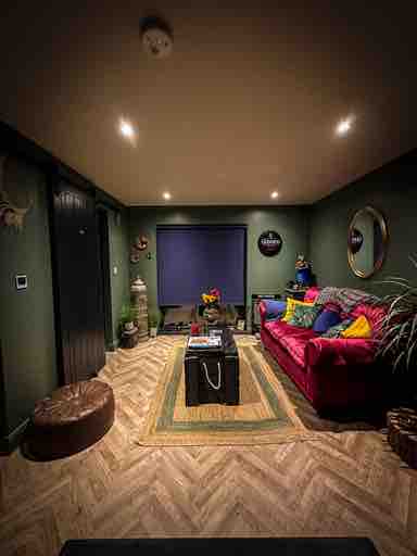 The Love Hub is designed for couples to enjoy. Light the log burner and cozy up together on the couch. The garden you can sit out and light up the Fire pit and BBQ and wine! The Star Portal room, you can cozy up in a double bed with glass ceiling where you can look up to the Stars at night. There is a private wood fired 8 person Hot Tub with disco ball and Cinema Projector with Netflix, Prime and Disney+. In the evening he Love Hub has amazing lighting and sets the mood for an amazing night.