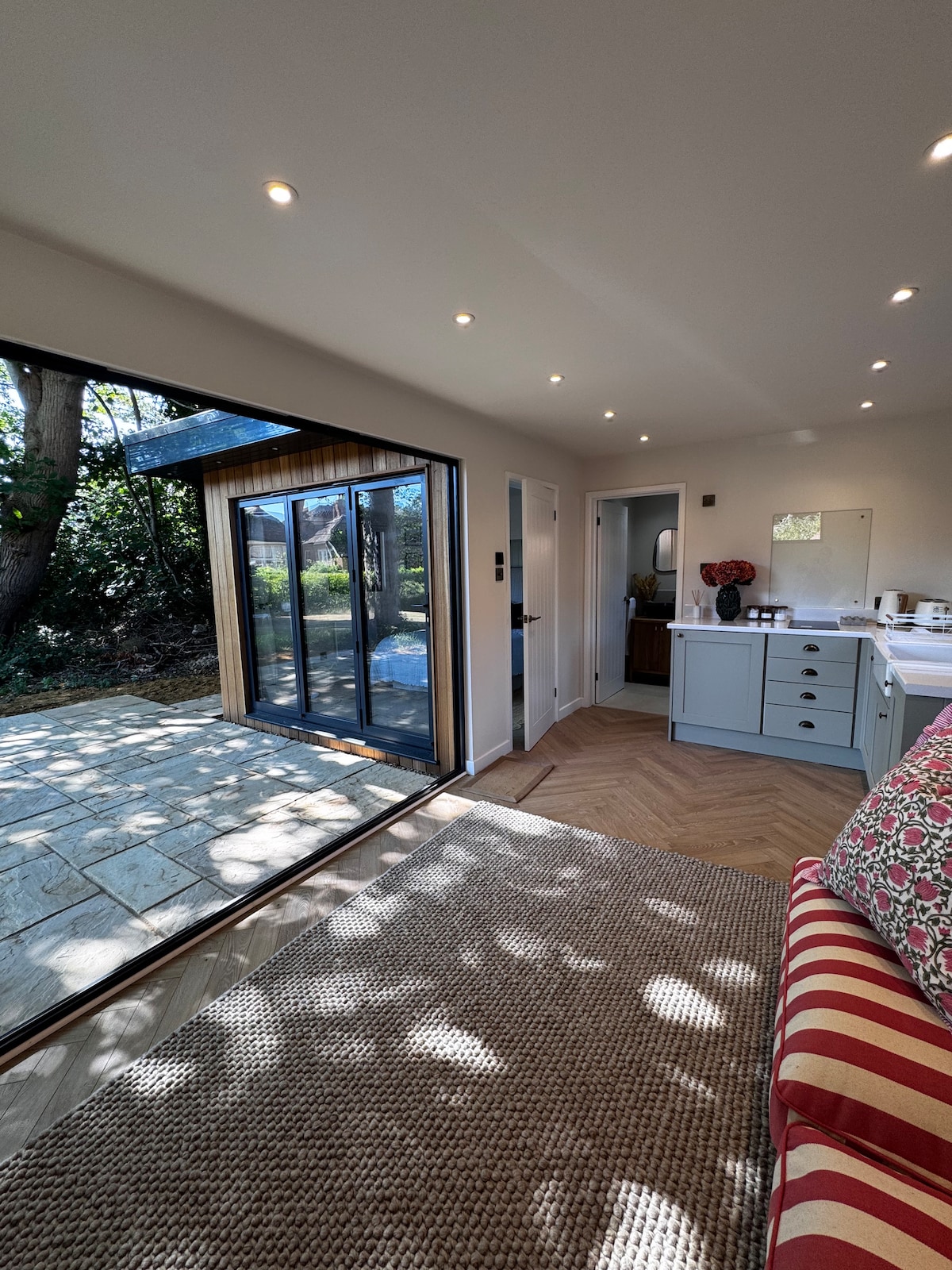 This is an integrated living space and bedroom with en suite bathroom. It is separate from the main house with total privacy. Guests are free to use a simple kitchen within the main house. Breakfast is included. The gardens are extensive. The feeling of the place is that of being in the deep Oxfordshire countryside; but the reality is that we are only 10 minutes walk away from South Oxford and 30 minutes walk away from Oxford centre.