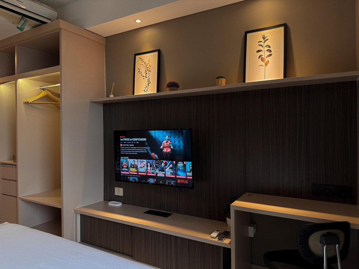 Nearby to JIEXPO and JIS, our studio at Maplepark apartment offers modern comfort, high-speed internet & Netflix. The open-plan layout features sleek furnishings, abundant natural light, and seamless working, & sleeping areas. The well-equipped kitchenette and plush sleeping area ensure comfort and practicality. With easy access to your events and a private balcony offering pool views, this studio combines urban sophistication with cozy charm, making it the perfect home in the heart of Jakarta.