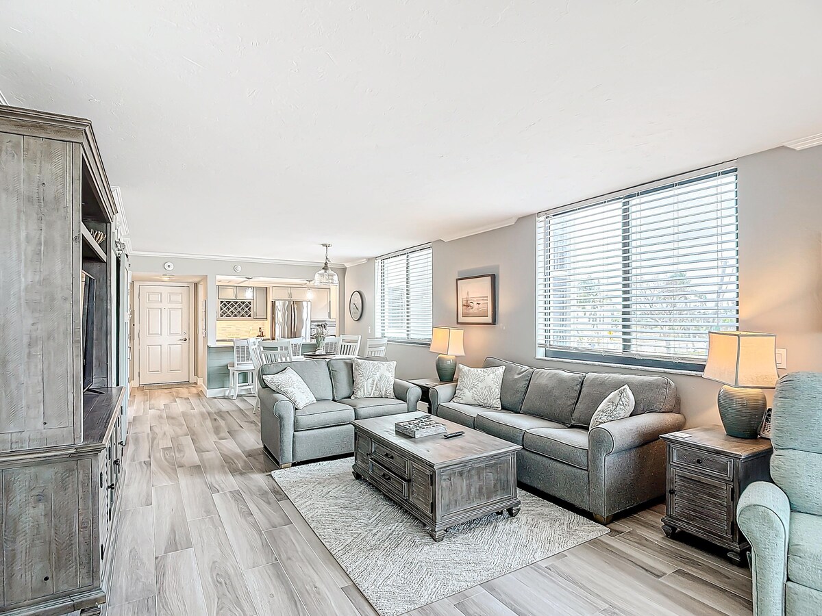 Welcome to Tide & Seek! This stylish 2BR/2BA condo at GullWing Beach Resort on the peaceful south end of Fort Myers Beach sleeps 6 and features an open living space, full kitchen with coffee & wine bar, and a screened balcony with angled Gulf views. Enjoy resort amenities including a heated pool, spa, grilling area, newly renovated tennis & racquetball courts (we provide equipment for guest use), and direct beach access for a relaxed coastal getaway!
