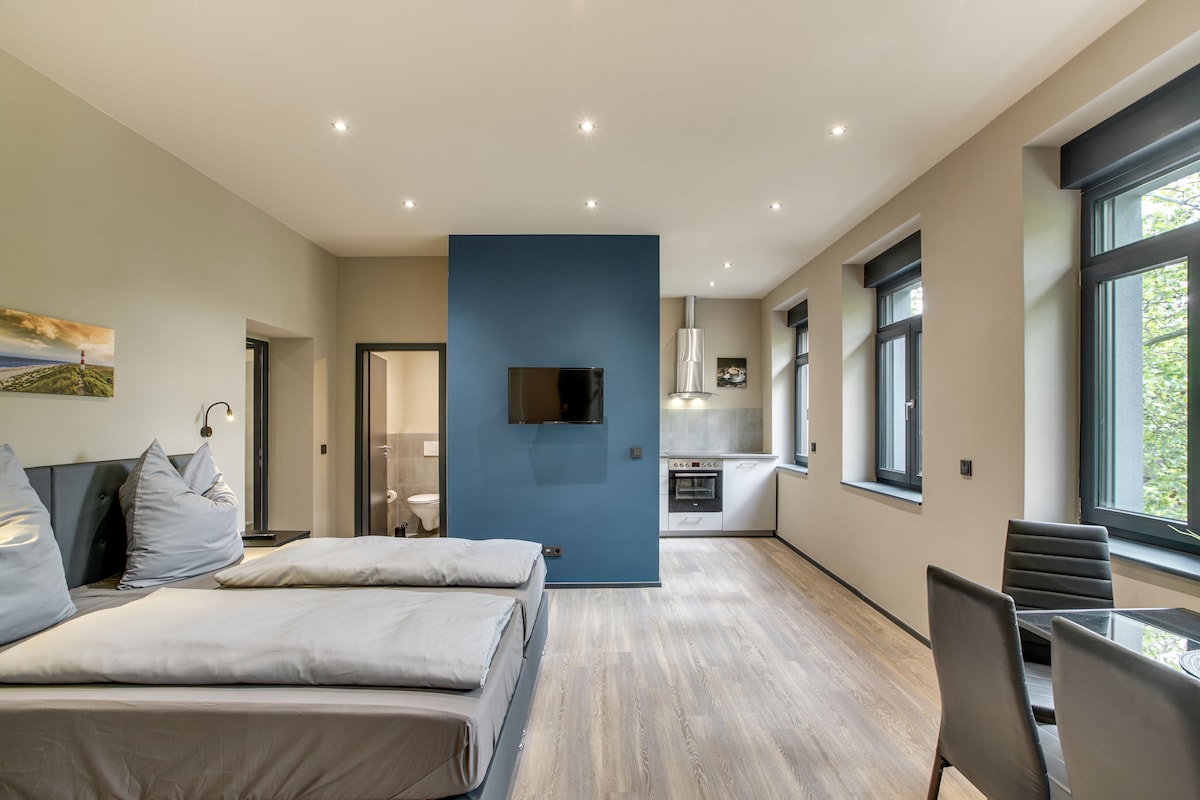 The Atrium Apart Hotel in Brühl offers modern hotel apartments for both short and long-term stays. It features a fully equipped kitchenette, high-speed Wi-Fi, and private parking facilities. The accommodation utilizes smart technologies for efficient check-in and offers co-working spaces as well as a coffee station in the lobby. Conveniently located, the hotel is just a few kilometers from Phantasialand and provides easy access to public transportation leading to Cologne and Bonn.