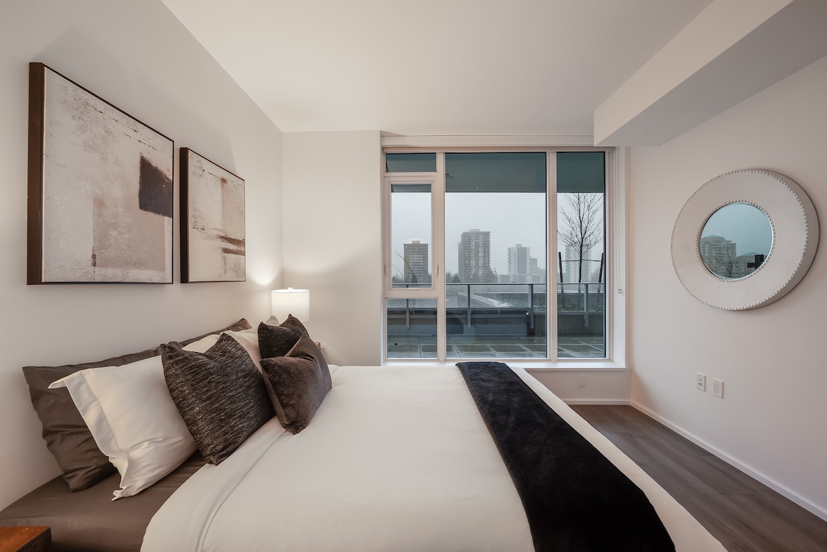 Welcome to your new favorite vacation spot! This stylish condo offers the following, and more... •1 queen bed and wall length windows in bedroom •Sofa bed for 2 in living room •Fully equipped kitchen with Nespresso machine! •Bathroom equipped with basic toiletries for your convenience •Private balcony •Natural light everywhere •Prime location, close to Lougheed centre where you'll find lots of stores and restaurants, even a gym! •Short 8 minute walk to the skytrain station •New and safe building