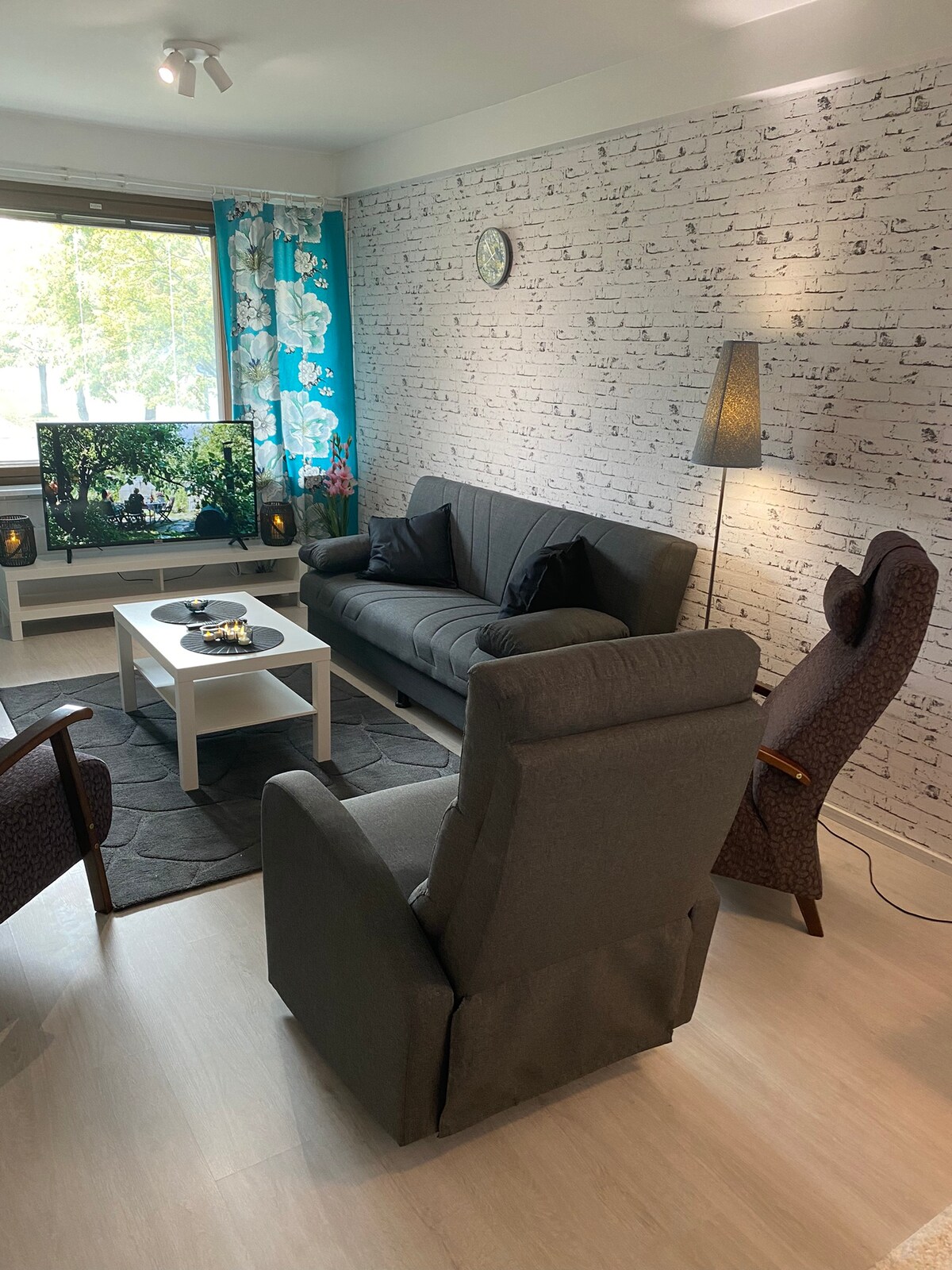 55 sqm two-bedroom apartment on the street level by the lake near the city center. End apartment with its own entrance. Windows mostly facing the lake. - Apartment-wide glazed balcony (in use in summer) - 2 free parking spaces with electricity - 300M Wi-Fi / 40” smart TV in the living room - Washing machine/detergent/drying rack - Double bed / sofa bed for two - Linens and towels included in the price - Affordable (weekly -17% monthly -45%)! - Self check-in, arrival 3:00 p.m. -> / departure by 12:00 p.m.