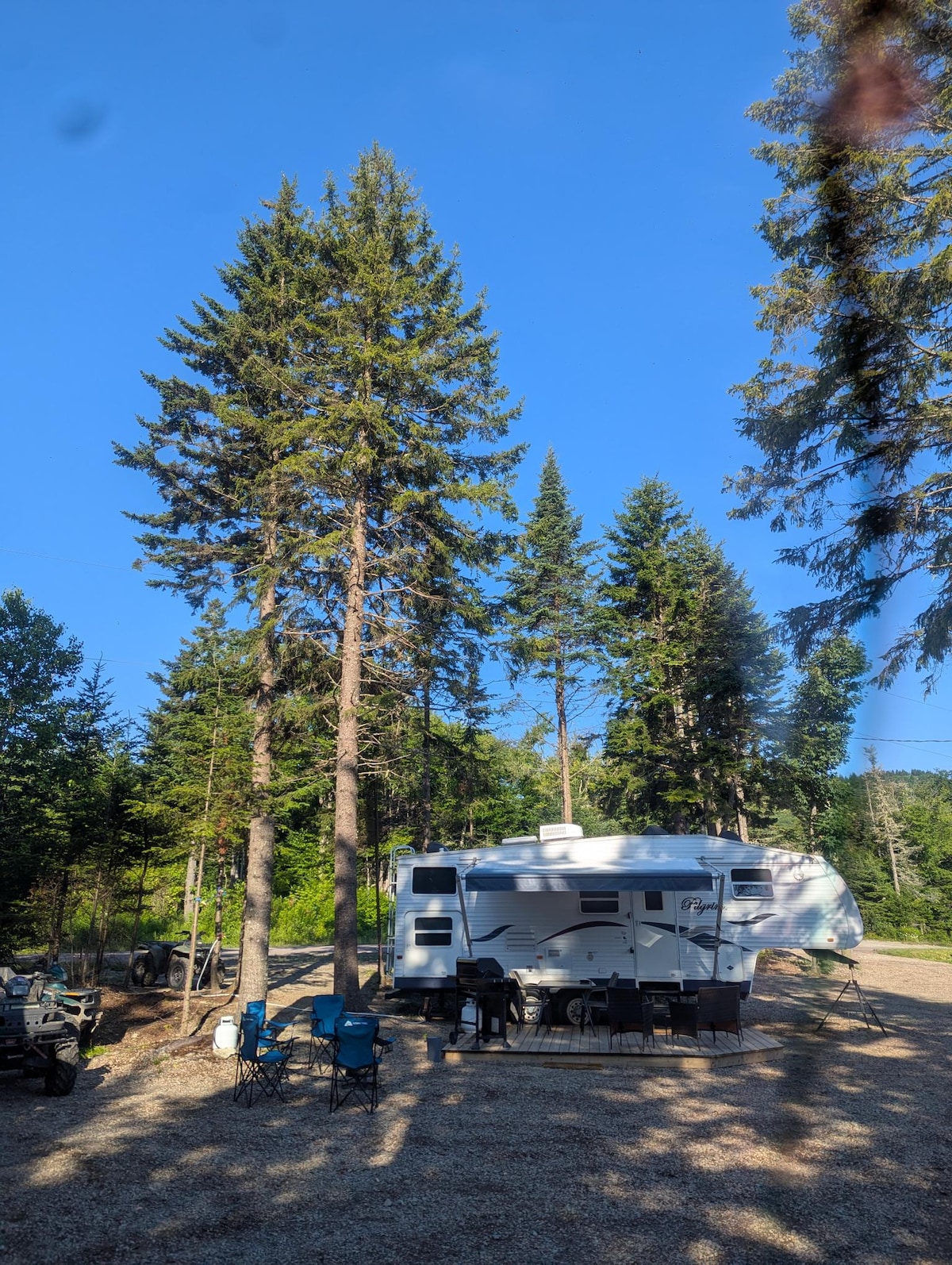 Tucked away in the wilderness of Alma, We are a Private Family Camp. The Pilgrim 5th Wheel trailer sleeps 2 adults in master bedroom, 2 children or Young Adults 200lbs max in rear single wide bunks. Pets allowed. Each RV boasts a large wood deck, awning, patio furniture, gas BBQ and gas fire pit. ATV trails nearby. We are central to Fundy National Park, Hopewell Rocks & the village of Alma, with gift shops, fabulous restaurants & the BEST lobster! Very ATV friendly. Waterside Beach 2 km away.
