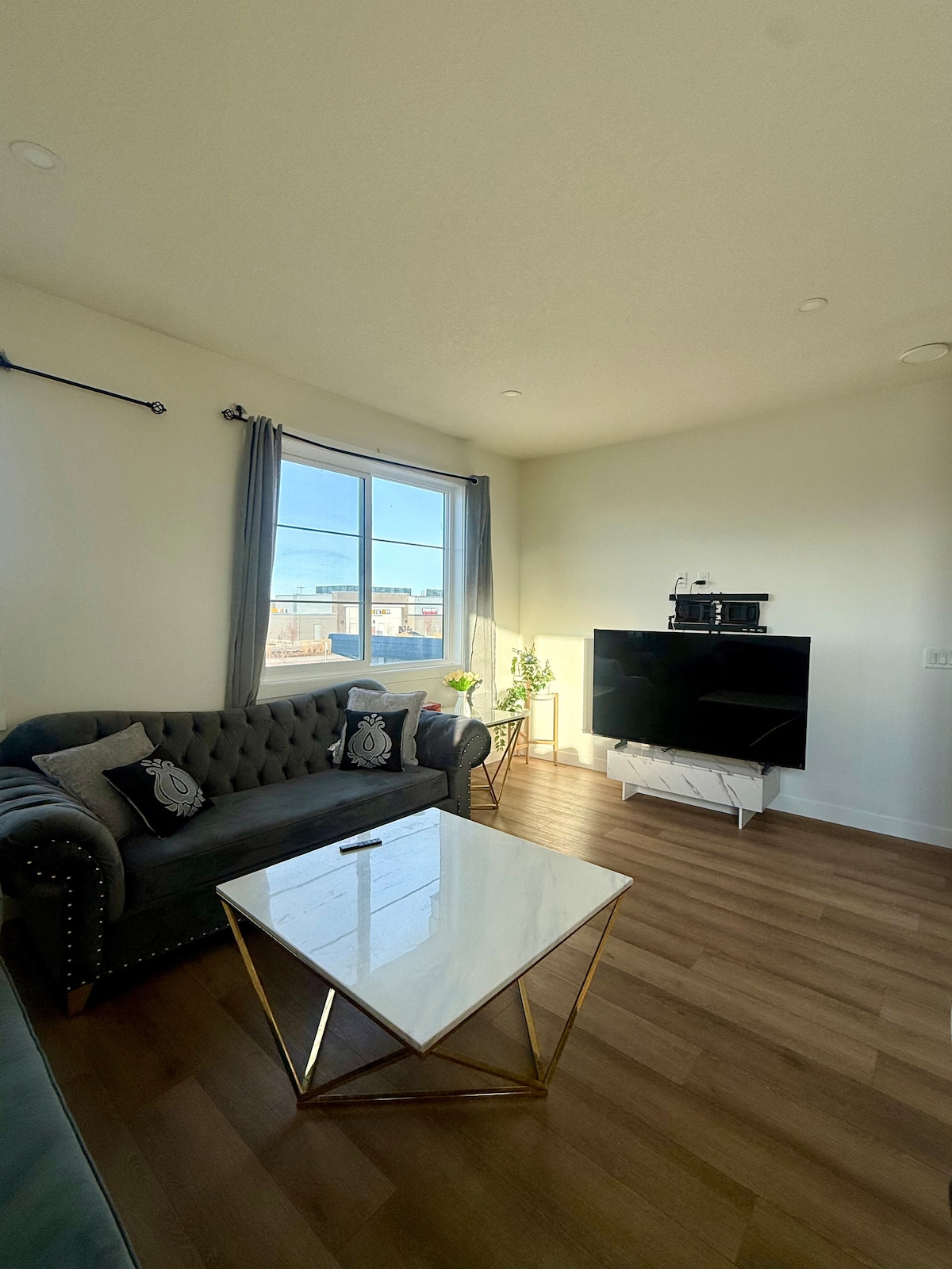 Welcome to our brand new townhouse with all the love of our family. We have infinite love for this little home. As a family with a large family travel experience, we carefully arranged the family room to give a comfortable travel experience for small families. Double rooms and large beds also provide enough spacious and bright space for a family of four. Newly installed central air conditioning + smart TV + Netflix membership especially for summer. It is worth mentioning that our townhouse is in a great location, within a 15-minute drive to Calgary International Airport, and the most famous shopping malls CROSSIRON MALL, COSTCO, within a 5-minute walk to McDonald's, Starbucks, Timhortons, the most competitive Nofrills affordable supermarket. Note: This warm townhouse is only an hour and a half drive from the world-famous Banff National Park, and you can also visit the stunning Lake Louise, Hoodoos Trail Head, Bow Falls viewpoint... and other wonderful natural scenery.