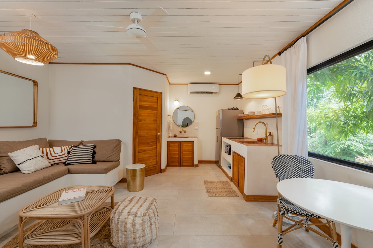 Grand reopening mid-November after an extensive remodel. Boheme consists of 6 boutique apartments (2 buildings)and is located in the heart of Playa Guiones- the beautiful, surf and yoga haven in Costa Rica. This fully air-conditioned unit consists of a sizable living room with a large sofa, a very comfortable bedroom with a king bed, kitchenette, and a large shower. It is approximately 600 sq/ft in size.