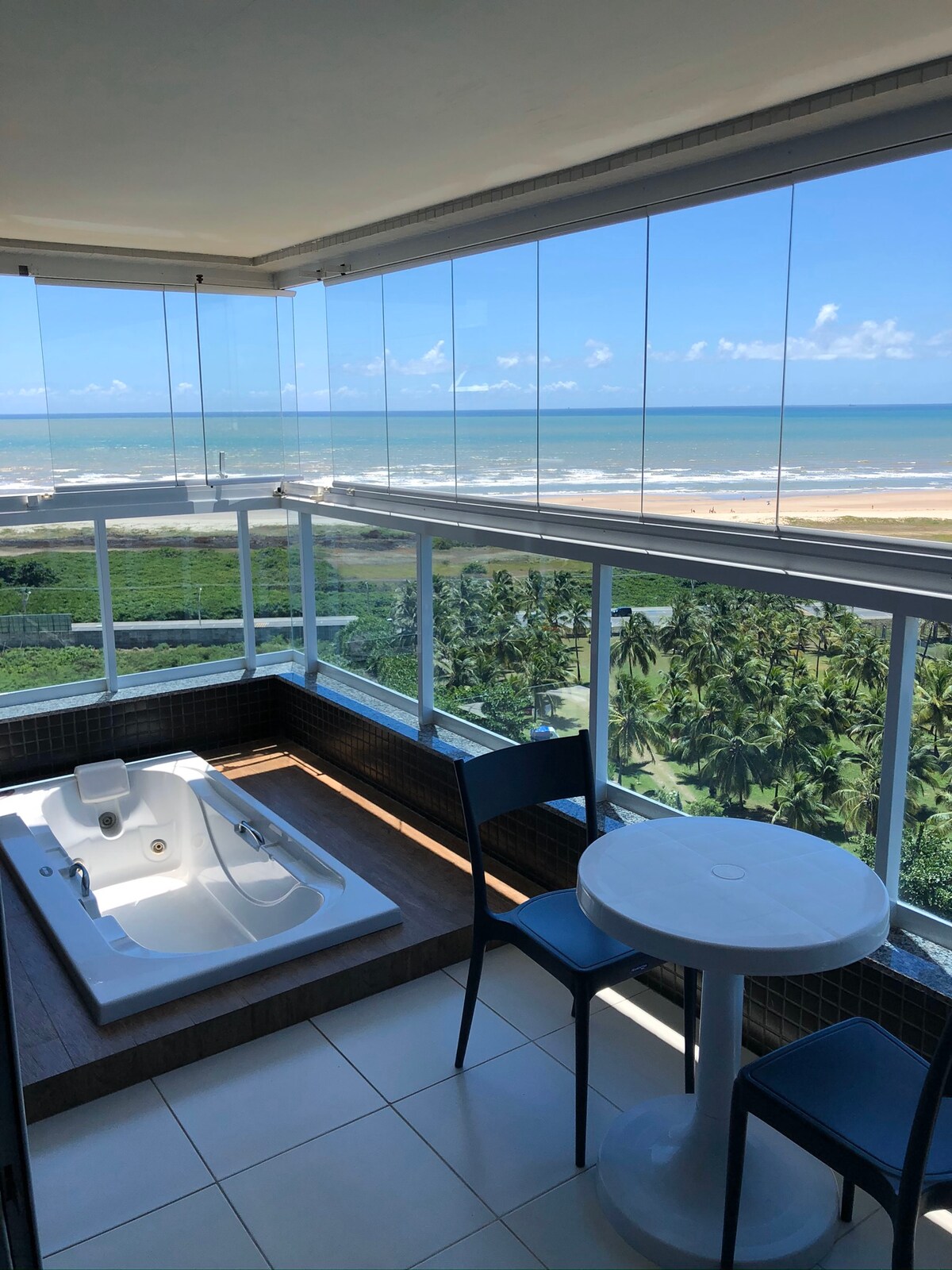 Fully furnished seaside apartment, with Jacuzzi (currently the Jacuzzi only functions as a bathtub) on the balcony, various household appliances, washing machine, refrigerator, Nespresso coffee machine, dishes, cutlery, blender, sandwich maker, clothes dryer, microwave, vacuum cleaner, Wi-Fi, split air-conditioning in the 2 bedrooms, and now with a space for a home office, etc.