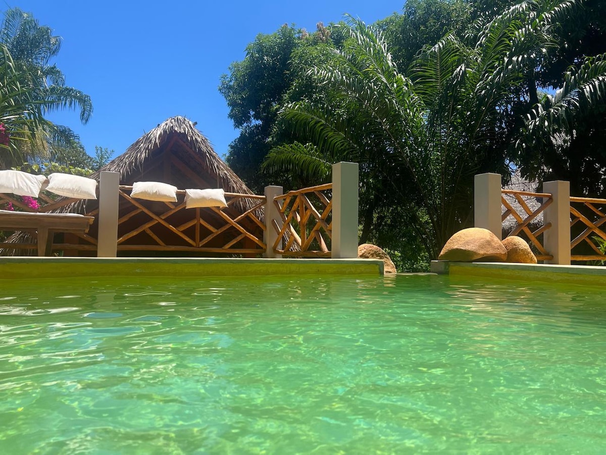 Un charmant bungalow niché au milieu d'une propriété verdoyante agrémentée d'une piscine et d'un grand jardin vous attend. Grâce à son emplacement, à proximité des supermarchés et non loin de la plage, ce refuge vous permet de profiter pleinement de votre séjour à Nosy Be. Il est équipé d'un lit double, d'une salle de bain et d'une toilette privatives, ainsi que d'une cuisine avec un réfrigérateur et une plaque à gaz.