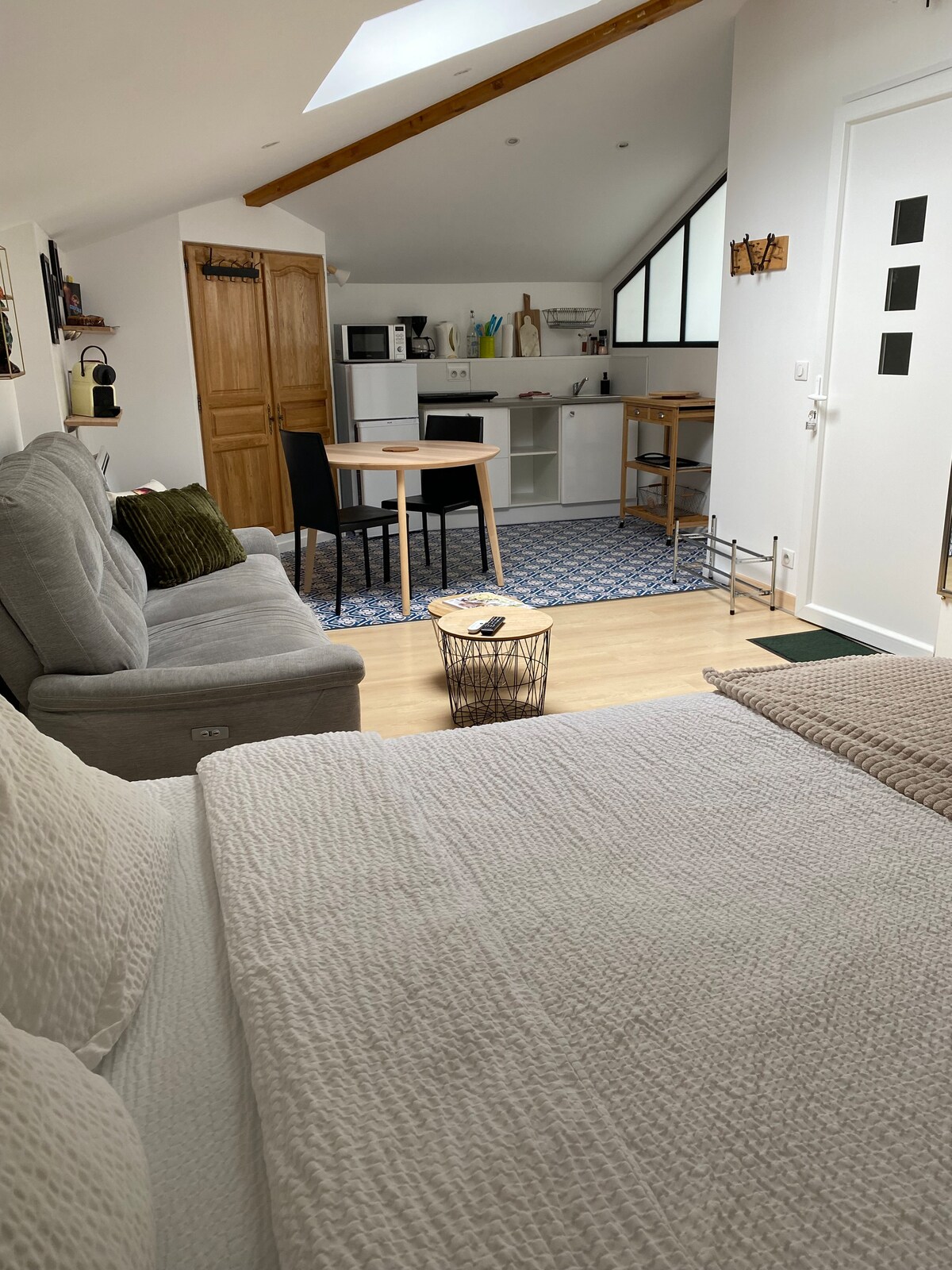 In a large secure private property with gate and parking, you will find an ideal pied-à-terre. Beautiful 32 m2 studio, very comfortable. Quietly located and close to a main road. You will have a good double bed, new mattress, duvet and cozy pillows. Linens and towels are provided, everything will be ready to welcome you. The studio is fully equipped with TV/WiFi + raclette duo device + cooking essentials.