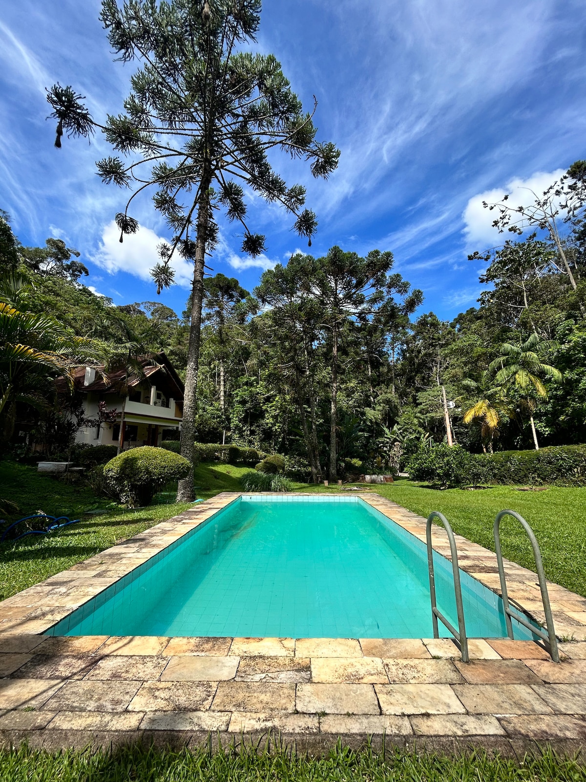 Very comfortable ranch located on Estrada Mury-Lumiar (7 km from Lumiar). House with 5 bedrooms, 3 bathrooms, 2 balconies, great living room, integrated dining room, 2 fireplaces, bar, swimming pool, complete barbecue with covered area, freezer and bathroom. Easy access, 300 meters from the asphalt. Large outdoor area with a stream, waterfall, natural pool, grassy field and lake, among other attractions. We have fiber optic internet access and satellite redundancy (Starlink).