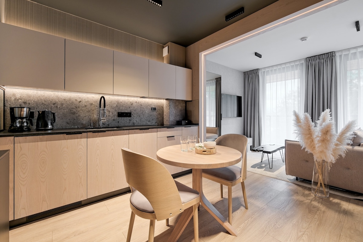 Fully equipped, designer apartment with a sunny terrace in a modern neighborhood in a quiet, recreational part of the city. Next door, cross-country skiing trails and scenic bike paths start (which can be moved both towards Gorce, the Tatras, the Czorsztyn Lagoon and Slovakia). A few steps from the apartment are playgrounds, a grocery store, a gym, and a restaurant. The proximity of the Bór Reserve in Czerwony and Dunajec guarantees excellent conditions for relaxing in nature.