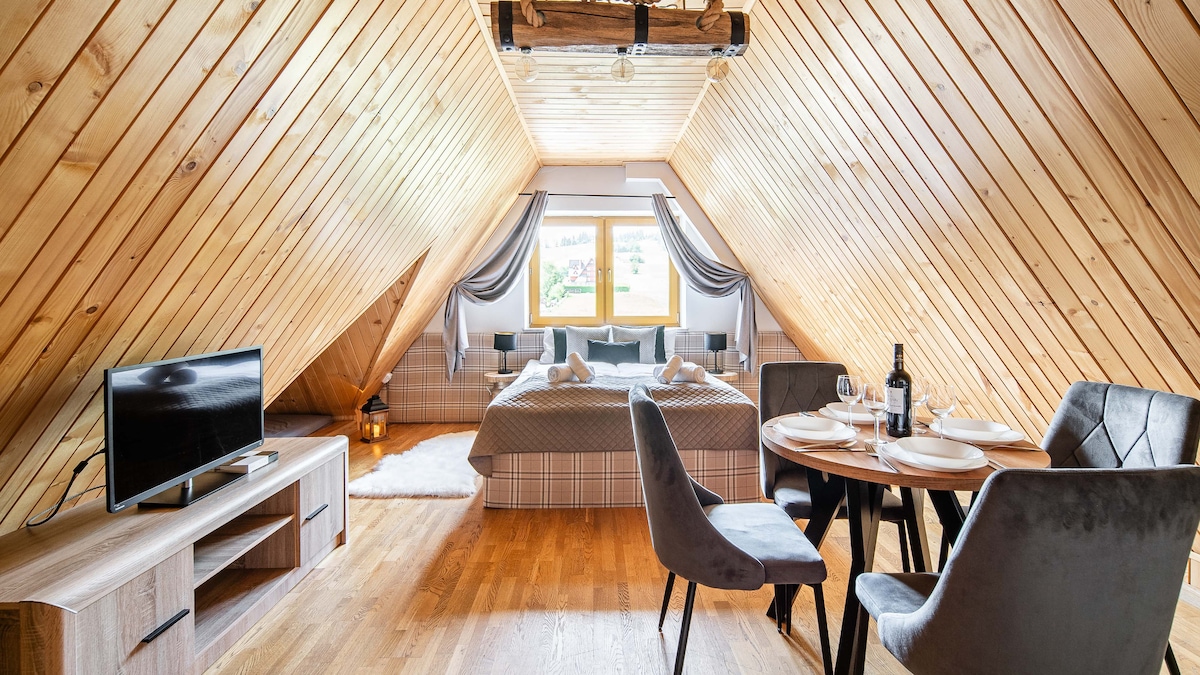 Discount Card - Free! We offer our guests a luxury duplex apartment for up to 8 people. The ground floor is a spacious living room with a fireplace, a fully equipped kitchen, a bathroom, and a patio that will make your stay more enjoyable. The floor is two rooms and a spacious bathroom with a sauna, which you will appreciate staying in our apartment in winter. The apartment has internet access (WiFi). 2013, the apartment was selected for the nicest furnished apartment in Szczawnica.