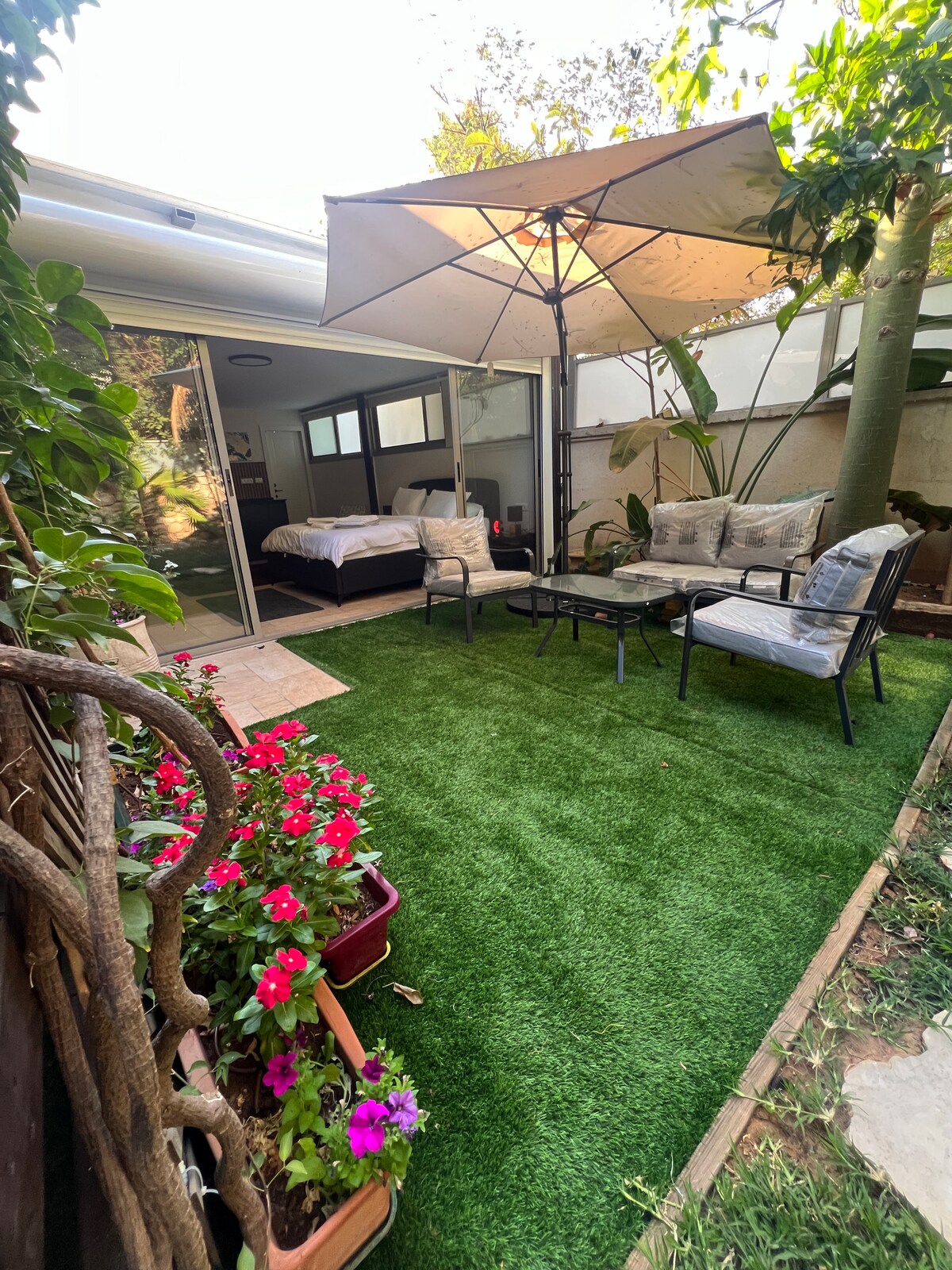 ⸻ Stylish garden suite with a fresh, modern design in one of Tel Aviv’s safest and most desirable areas. Enjoy ultra-fast fiber Wi-Fi, powerful new AC, fully equipped kitchen with Nespresso, new bathroom, and all-new furniture. Washing machine and dryer in the yard. Step out to a private garden with seating. Free street parking is usually available. A shared shelter is just 5 meters away. The perfect calm and relaxing stay in Tel Aviv.