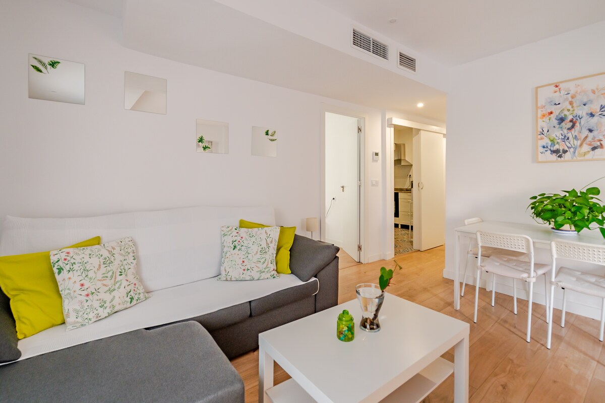 Within the plot of our house we have renovated this beautiful one-bedroom apartment in an open and modern style. The apartment has a separate entrance, kitchen and bathroom, workspace, and a living room that opens to the bedroom. It also has a patio for outdoor living, bright windows, and everything you need to relax It is located in the city belt, easy access by public transport (next to the metro and bus) or car (free parking area)