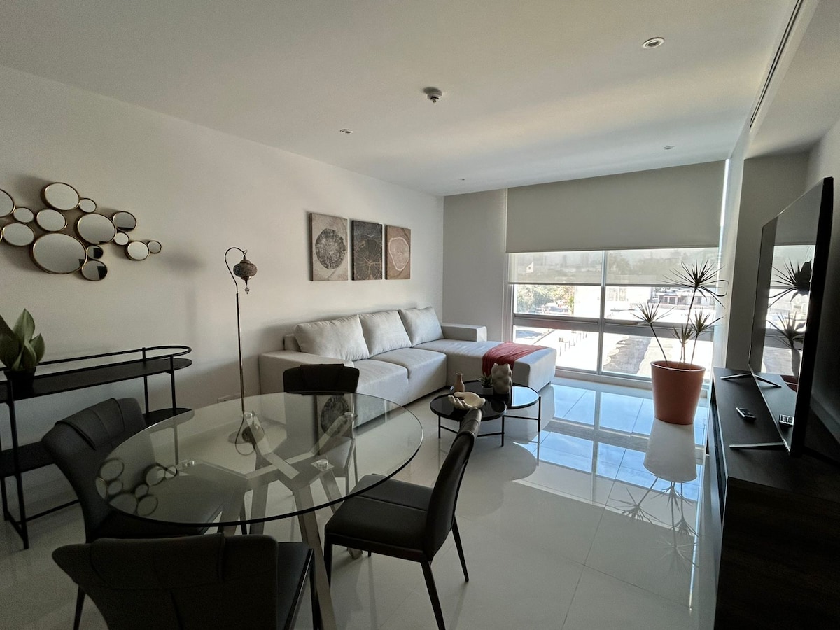 ✨ Experience Monterrey from Above 🌆 Relax in our modern 2BR/2BA apartment in San Pedro with stunning panoramic views. Two queen beds, 2 full bathrooms, fully equipped kitchen, A/C, fast WiFi, washer-dryer, parking & 24/7 security. Perfect for business, medical or leisure trips: minutes from top hospitals, Showcenter, shopping centers and the best restaurants. Ideal for short or long stays, blending the comfort of home with the boutique experience only San Pedro can offer.