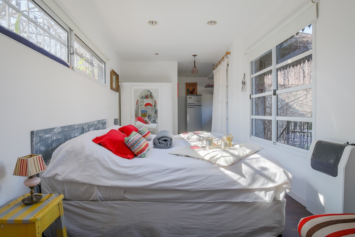 El departamento es un estudio completamente equipado, ubicado en un segundo piso al que se accede por una escalera lateral. Con una decoración única y acogedora, baño privado y kitchenette. Cama king con vista a un patio interno o jardín lleno de plantas y flores.