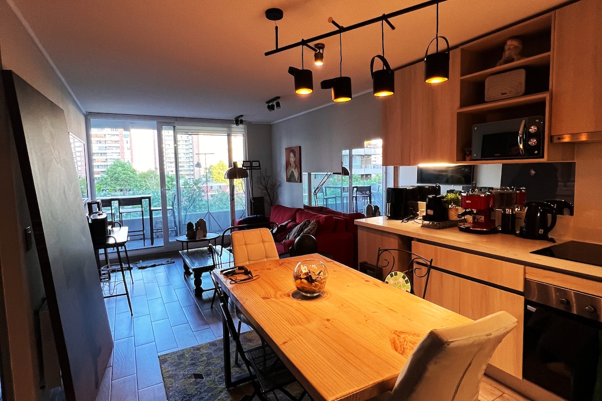 Enjoy our modern, quiet and centrally located north-facing accommodation, very well connected to a metro station, supermarket, banks and commerce in general, close to the bohemia of Plaza Ñuñoa, the National Stadium and restaurants with all the vibes of the neighborhood . If you like cooking, this is your place. We have thought of a kitchen integrated into the spaces with comfortable and modern equipment. Includes underground parking in the building.