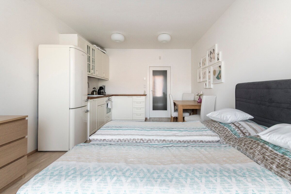 Discover the charm of modern living in our designer studio at the Hagibor complex! Enjoy the comfort of home with a fully equipped kitchen, Nespresso coffee maker, and relaxing book or Netflix evenings. With a balcony, garage parking, and fast internet, it's an oasis of calm in the bustling city. Just a short walk from Želivského metro station on the green line, you're moments away from the historic city center. The perfect place for your urban adventure!:-)