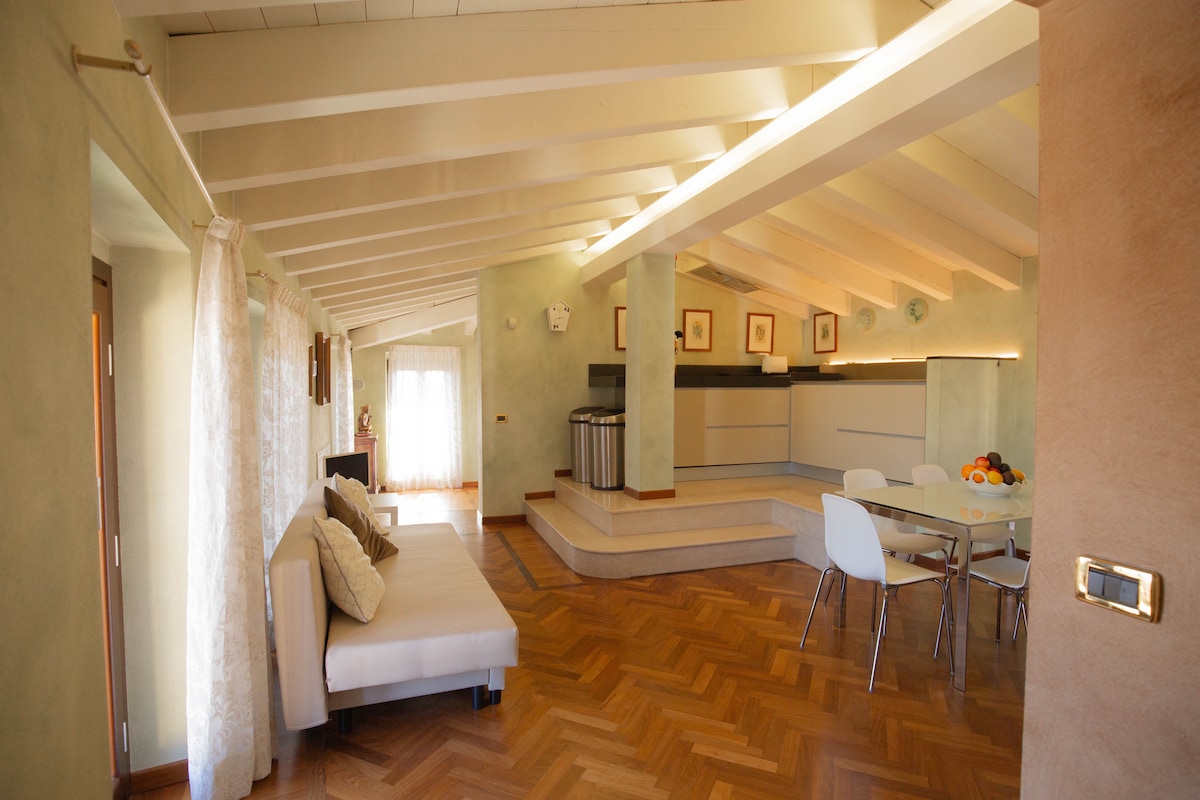 Large and bright 1 bedroom flat part of a private residence of the late XVII century. The house is located in Mocasina, a tiny village immersed in the colourful and wild nature of the Valtenesi valley, only 6 km away from lake Garda. Homemade breakfast included.