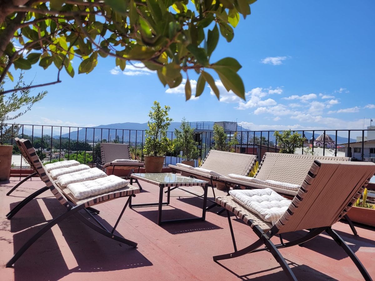 Five minutes walk from the historic center. Close to historical museums and local gastronomy markets, natural lighting and a terrace with a spectacular view of the San Felipe hill (considered the lung of Oaxaca due to its vegetation and clean water). On the ground floor of the building you can taste a local specialty coffee and discover the colorful world of regional textiles. Get ready to live beautiful experiences!