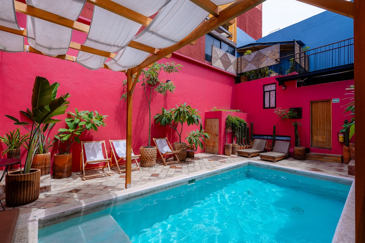 Step back in time as HOLT breathes new life into this 120-year-old hacienda in Oaxaca's Centro Historico, only three blocks walk to Zócalo. Glamorous rooms with two queen beds surround spacious outdoor courtyards featuring an oversized jacuzzi hot tub. Relax indoors - in our shared lounge - or outdoors while enjoying the complimentary breakfast or getting some work done on our always-up, blazing-fast Wi-Fi network. Take in the highlights of the city year-round with in-room heating and AC.