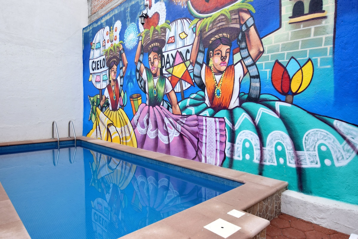 Enjoy an unforgettable getaway to Oaxaca! In this beautiful house located in the heart of the city, it has 4 spacious and comfortable rooms with king size bed each room, fresh with quarry floors. The outdoor pool is the perfect place to relax and cool off after a day of exploring the city. Located near tourist attractions, such as the Zócalo, the Temple of Santo Domingo, several traditional markets and close to a variety of restaurants, bars and shops.
