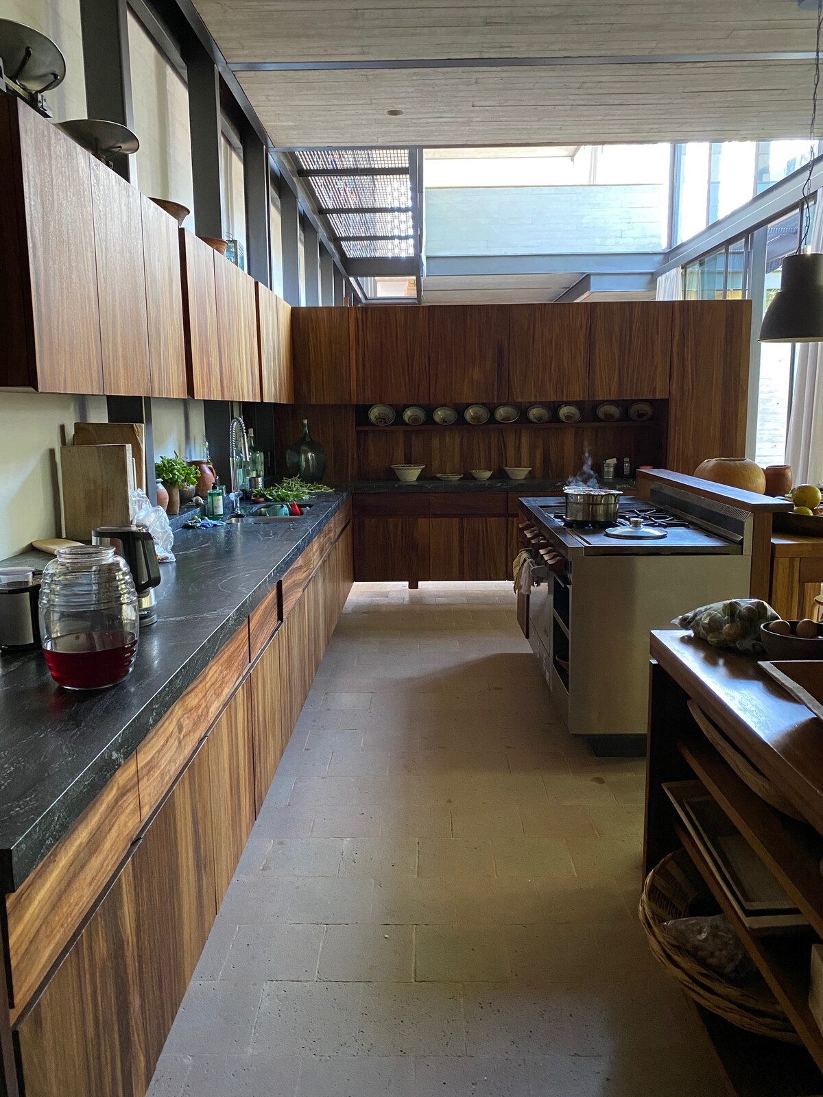 This unique house by the architect Mauricio Rocha is inspired by Arab architecture. The space is configured in different ways, from open rooms perfect for social gatherings to the private pool and steam sauna connected to the main bedroom. The house surrounds two beautiful plum trees that provide a perfect shade for midday gatherings, yet other spaces are perfect to enjoy the beautiful and warm sunlight.