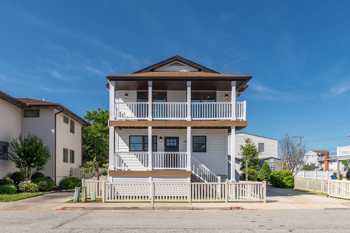 We welcome you to stay at our newly updated, beautifully furnished & decorated luxury 4 BR, 3.5BA home w/3 parking spaces (1 car garage & 2 assigned parking spaces) on 26th St, just 2 blocks (a 3-4 minute walk) from the boardwalk & the beach between Midtown & Downtown. Relax & enjoy the beautiful Sunset, Bayview from our double balconies in the front, Steps from JollyRogers Amusement Park & many miniature golf courses. Within walking distance, there arerestaurants/bars, shopping, & nightlife.