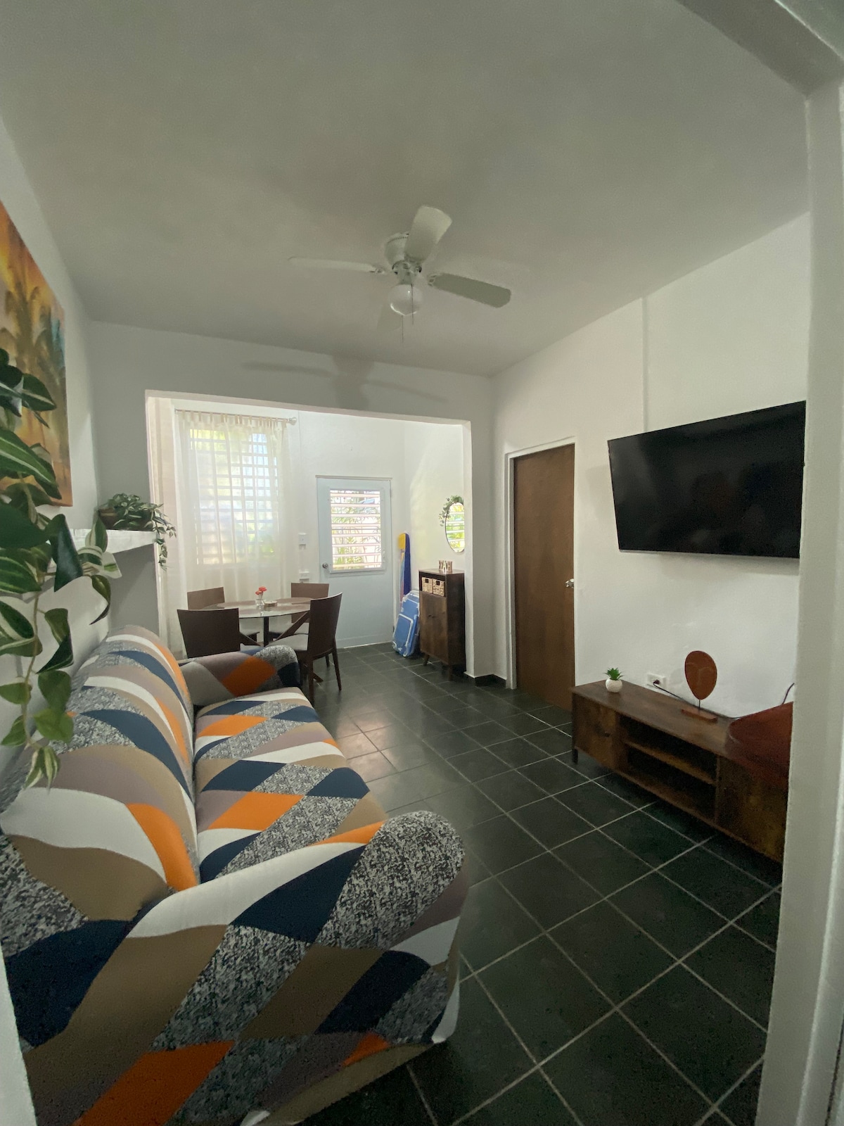 Enjoy your vacation in Puerto Rico in your very own casita within walking distance of the beach. This quaint stay is one of four units in a house on a central and lively street in San Juan. Just 1 block away from Loiza Street, and 2 blocks away from the beach. You can walk to great food trucks, restaurants, bars, yoga studios and more. This property has 1 bedroom with a king bed, a living room with a full futon, a kitchen with the basic amenities, a sparkling clean bathroom, and a small patio.
