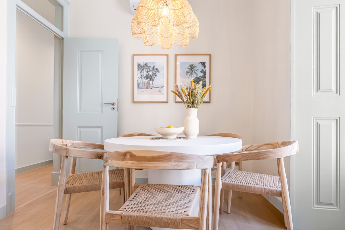 Apartamento reconstruído por arquitecto, excelente privacidade, exposição solar, com wifi, e praia a 150m. 1 suite com SPA e banho turco com aromaterapia. 1 suíte com terraço com vista mar, tela de projeção de cinema. Sala com vista de mar, rio, e terraço, onde poderá disfrutar de uma zona de estar e de um barbecue com grelha em ferro forjado. Perto de restaurantes, cafés e supermercado, e estação de comboio. Ar condicionado e piso aquecido em todas as áreas, TV 4K e box independente por suíte.