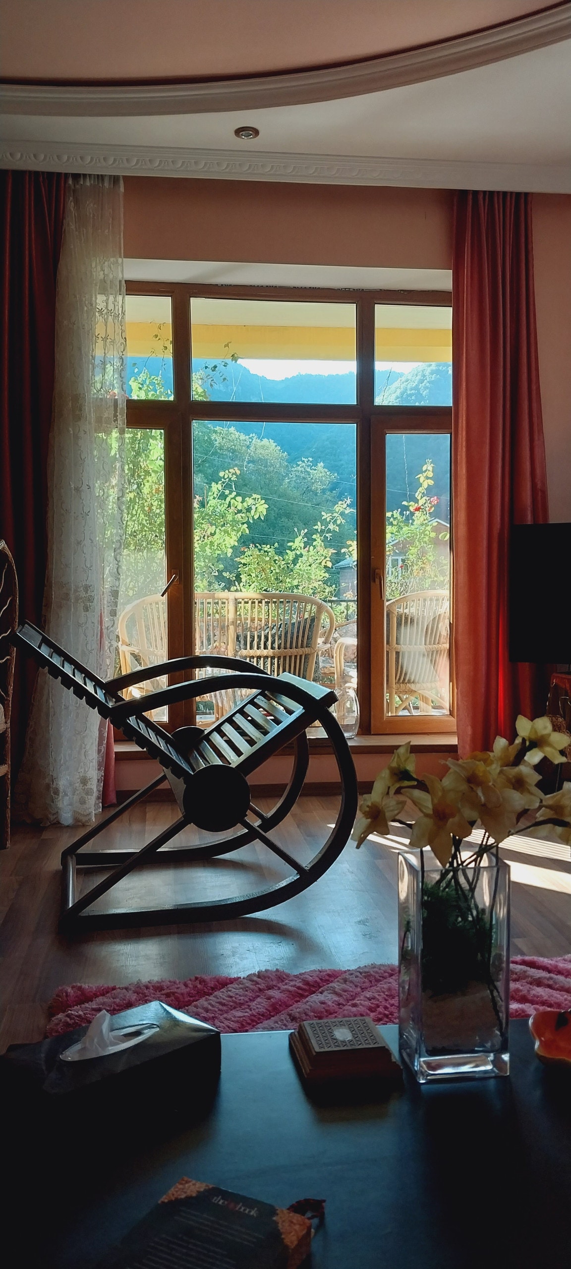 The guest house is located 100 meters from the forest, river and central road, in a beautiful scenic place surrounded by mountains. There are cafes and restaurants nearby. It has a large balcony and a separate yard. There is a swing and a barbecue in the yard. The apartment has a TV, internet, washing machine, refrigerator. The apartment consists of 3 rooms and has all the conditions for 6 people to rest. The spacious kitchen is equipped with every amenity.