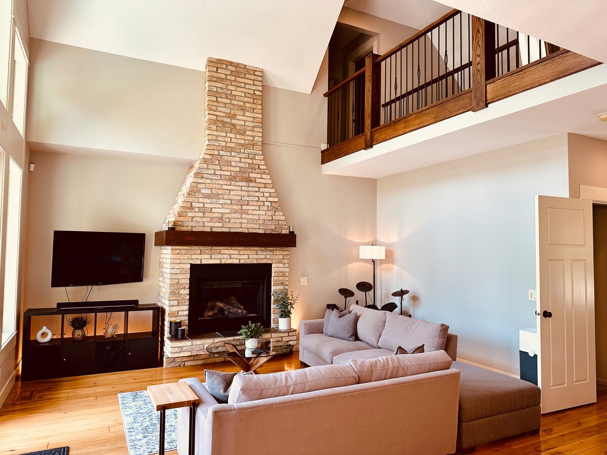 1000 sq. ft. Unobstructed views when you enter showing off a spectacular view of the lake and resort pools giving you an immediate sense of awe. This top floor unit means no one above you. This unit offers a king size adjustable bed in the main bedroom with a double in the loft. 16’ vaulted ceilings, full kitchen, washer dryer, 65” living room tv and a 56” in the main bedroom, side tables with USB plugins, deck furniture and fire table plus so much more. Extremely quiet and peaceful.