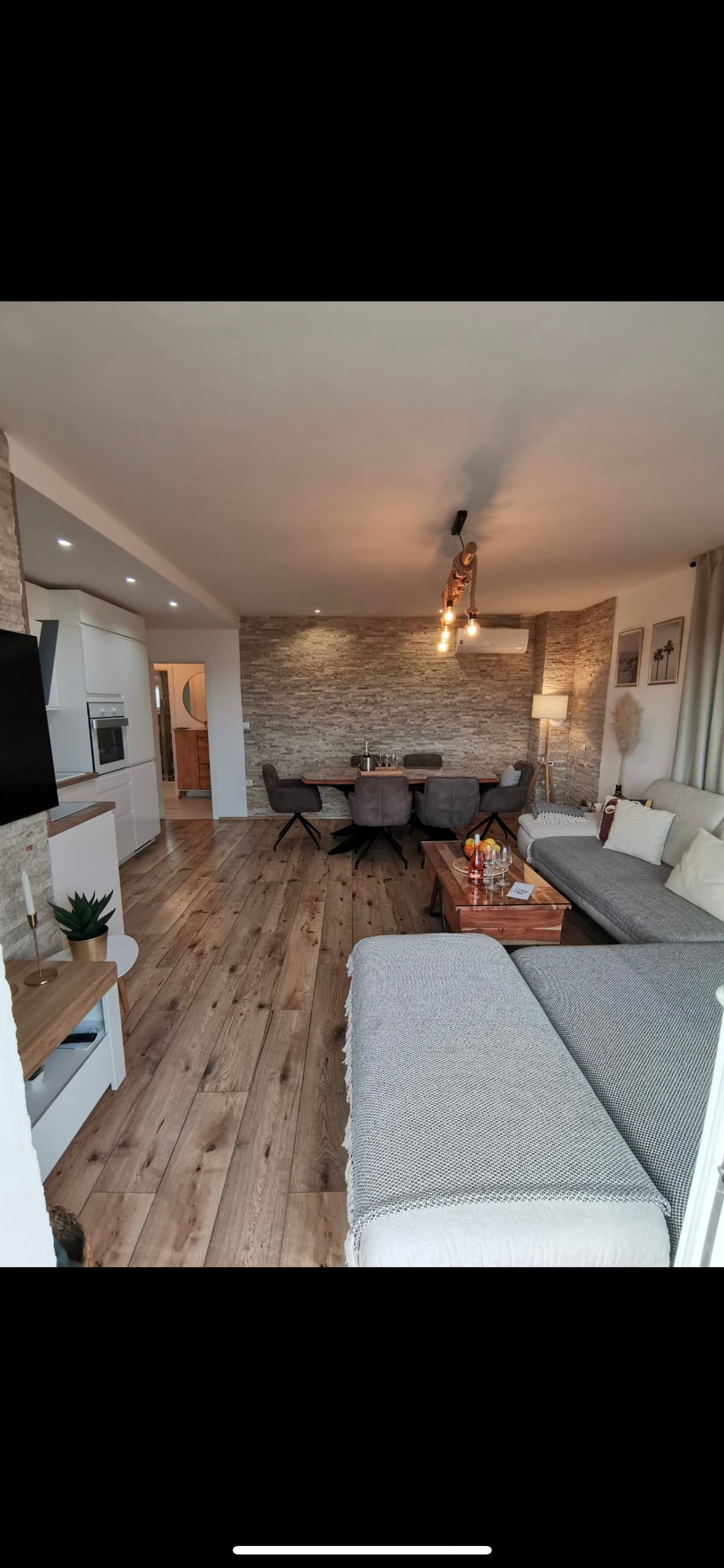 Perfect housing for families, provides there rooms, one for adults with privat bathroom, other two sheeting central bathroom that have jacuzzi bath tab. Living room have big sofa facing terrace and 55 inch UHD smart TV. Full size full equipped kitchen with big table for all guests. Other dining possibilities on seaview terrace. All indor areas air-conditioned. One floor down swimming pool with shade area equipped with big garden sofa, child toys and electric bike. Nice grill area.