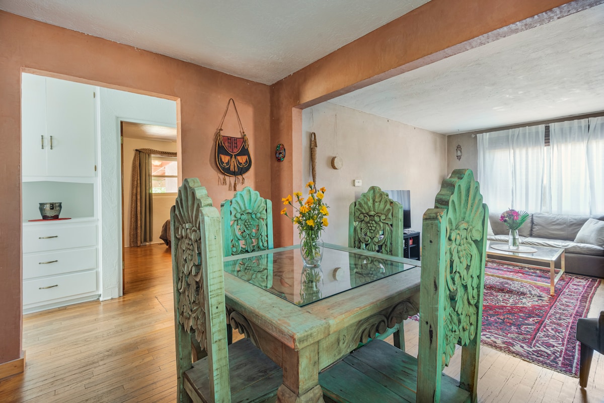 Casita Bohemia is a beautiful, unique, and private space. Walk to Old Town or the river, near public transit and freeways with everything needed for short or longer visits. The light-filled casita features original artwork, great reading material, and guides for shopping, museums, music, and other local nearby venues. Enjoy your privacy or explore the community! Your well-behaved pet is also welcome. In the securely fenced yard, you can enjoy remote work or outdoor dining much of the year.