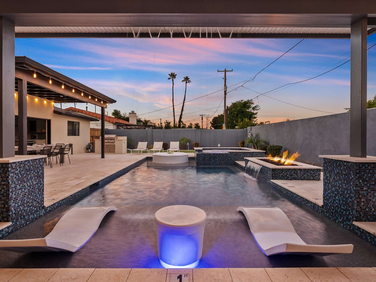 The waterfall in Old Town Scottsdale is a fully remodeled residence, centrally located in Old Town Scottsdale, minutes from the nightlife and one block from Scottsdale Stadium. With 4 bedrooms, 2 baths, a heated pool, a 12 person spa, firepits, a putting green, and a spacious outdoor living area it is truly one of the most unique residences in Old Town Scottsdale. Walkable to the stadium and restaurants, old town entertainment district is a 5 minute golf cart or lyft ride away!