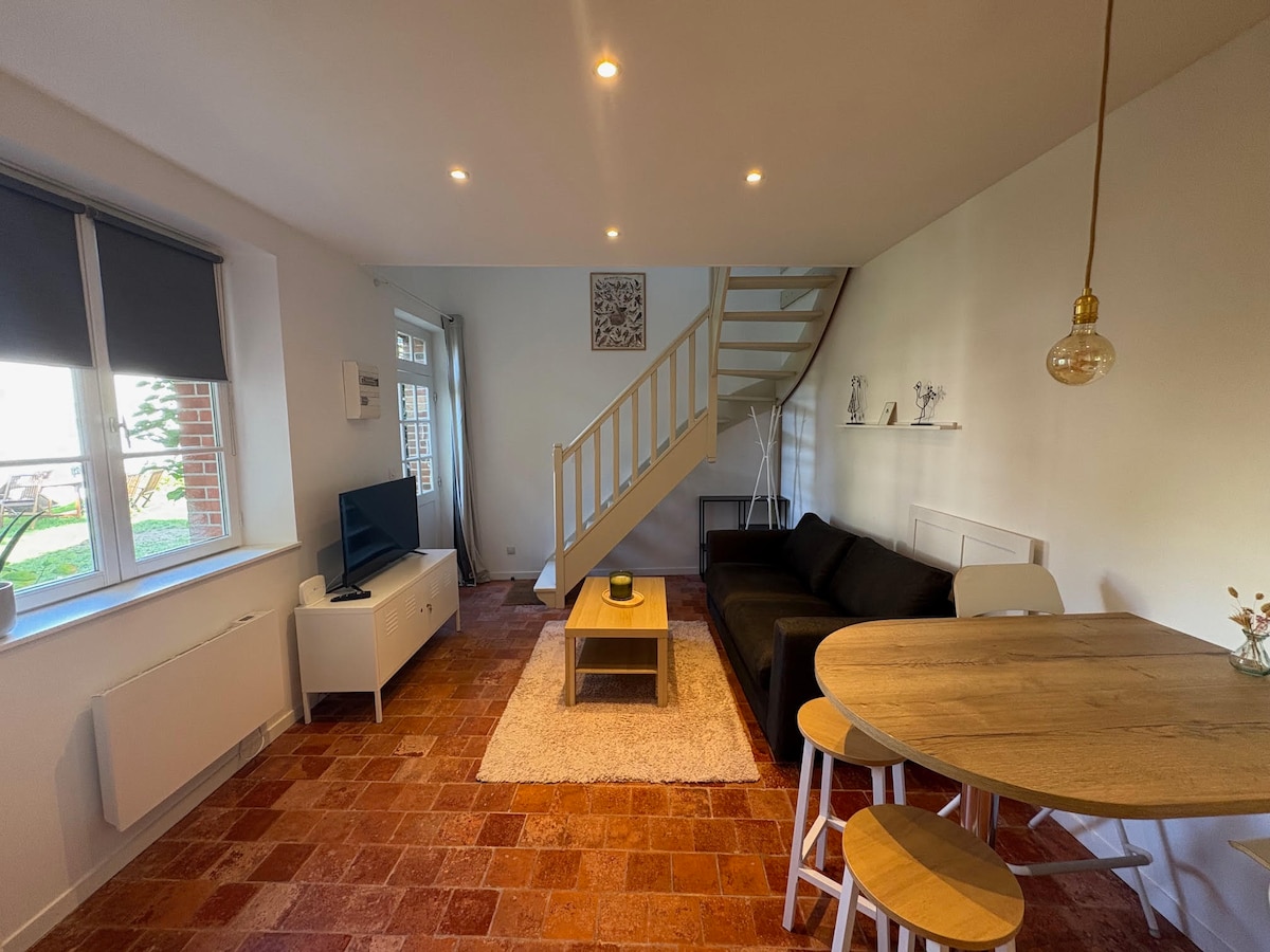 Renovated 65 m2 2-room apartment + mezzanine + balcony, on the first floor of the owners' house. 5 beds: 1 160 bed, 1 140 sofa bed in the living room and a 90 bed on the mezzanine. Independent access via outdoor staircase. Rented with a private parking space (but not covered). Direct access to the Loiret trails, close to the Loire by bike, 10 minutes' drive from Orléans. Despite proximity to the highway, no major noise disturbance in the apartment.