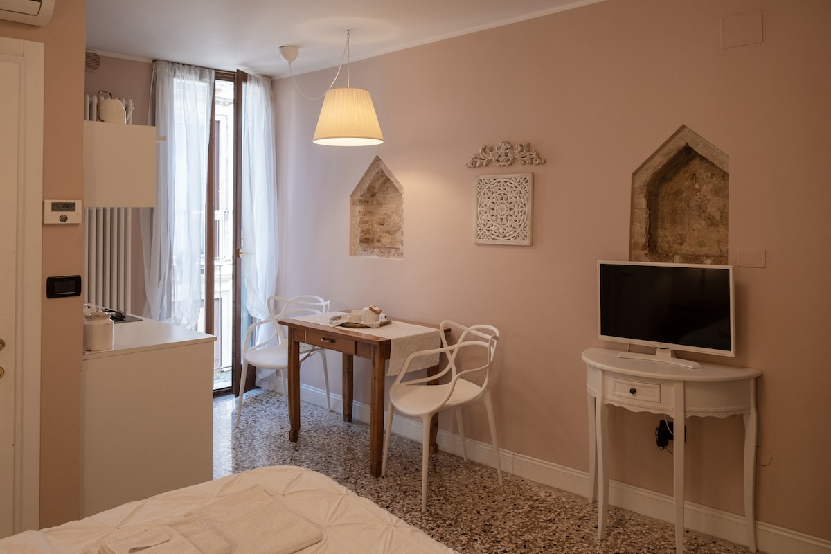 The Palladian Suite is a splendid apartment with a breathtaking panoramic view of the beauties of Vicenza: the Palladian Basilica, Palladio Square, and Signori Square. The suite, located in a historic building with an elevator, is finely furnished with everything you need for a comfortable stay: a King-Size bed, LG Ultra HD 4K TV with the best streaming services (Netflix, Youtube, etc.), air conditioning, and a kitchenette with a Nespresso coffee machine and LG microwave oven.