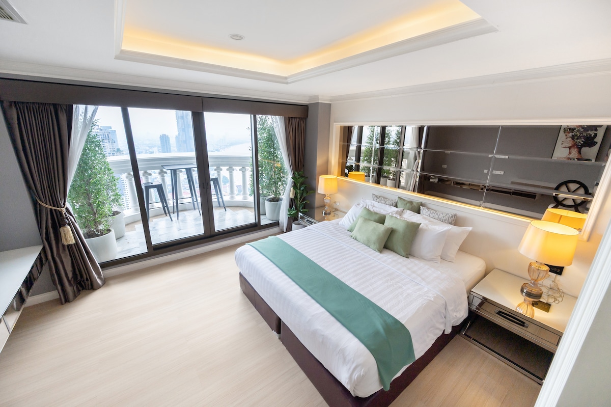 THE BEST VIEW OF BANGKOK!! ⭐5 star service from the HIGHEST RATED HOST in this building⭐ ✓Spectacular views of the Riverfront from our private balcony ✓Spacious 70sqm. ✓Street food galore(Michelin guide's) ✓Famous Sky Bar on top of the building (from the movie Hangover2) ✓High speed internet ✓Airport Pickup/Hassle free self check-in ✓Ideal location/5 mins walk to train&pier ✓Luggage deposit service ✓The best Bangkok guidebook written by me ✓Equipped with everything for a comfortable stay