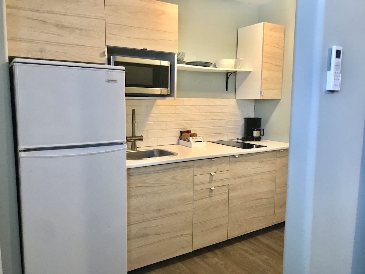 The deluxe suite has a kitchenette w/ 2 burner induction cooktop, sink, microwave, and 5' fridge with seperate freezer. Plenty of cupboard space, see list of supplies included in room. Bed: Comfy queen sized 4" pillow top w/ duvet and 2 queen sz pillows. Sofabed sleeps and sits 2. Large dresser houses a 50" smart tv with free netflix. Kids stay free! We are smoke free, pet friendly, trailer friendly and just plain friendly. We welcome you!