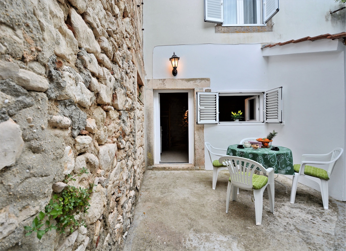 Small stone summer house with private entrance, 10m from the sea, no need for air condition. There are two levels, the bedroom is on the upper floor. Downstairs is a kitchen and a bathroom, and a small front yard with the dining table where the guests usually have their meals. Within walking range (500m) from the village center where one can find everything one could need when on vacation (supermarket, restaurants and cafe bars, doctor, sand beach, cultural events, etc...)