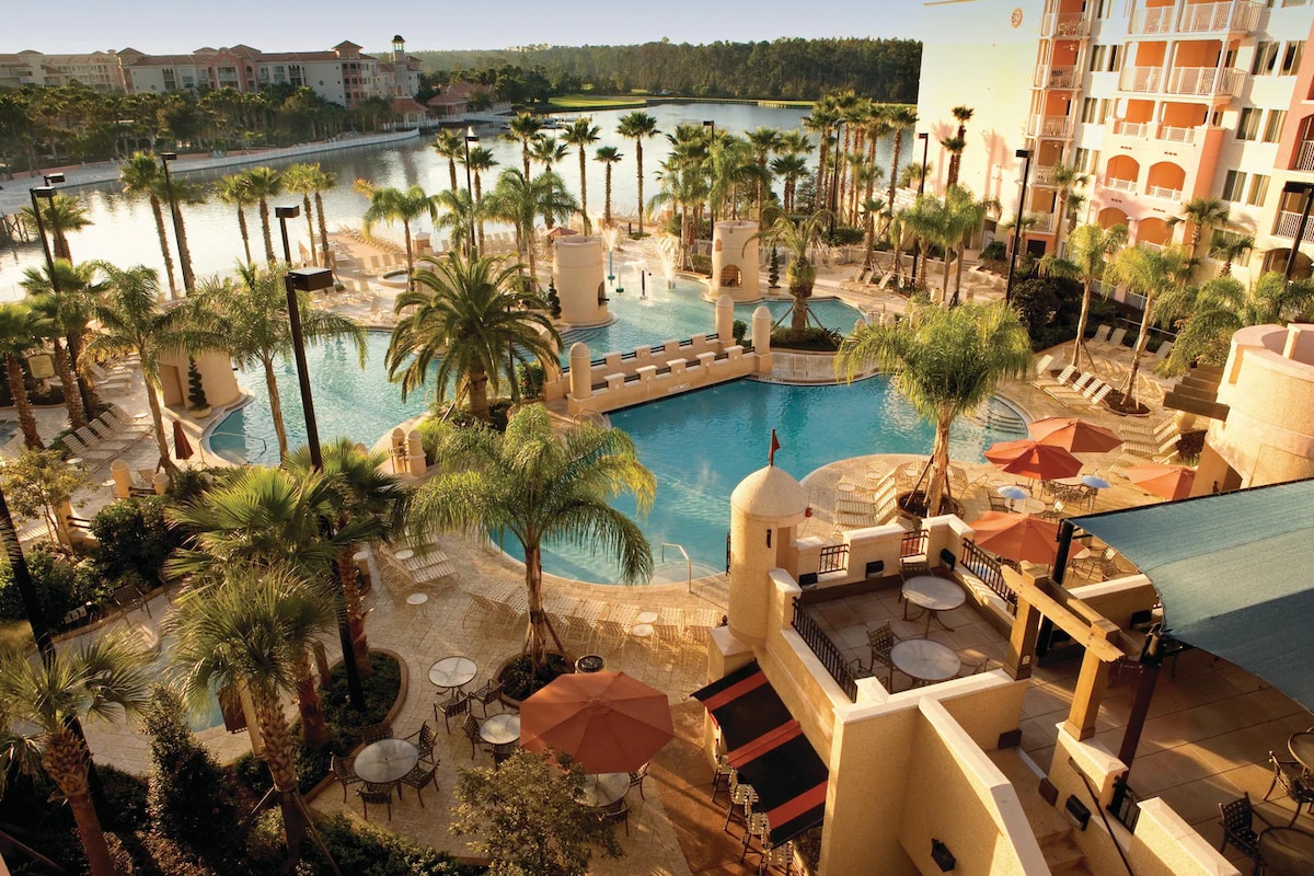 Discover a magical resort less than a mile from the gates of Walt Disney World®. When it's time to take a day off from the parks, chill out at the resort's five pools, lazy rivers and private rental cabanas or schedule time for some pampering at the spa. Ranked No. 10 on Condé Nast Traveler's "Best Resorts in Orlando, Florida: Readers' Choice Awards 2015." This is a 2 bdrm /2 bath just a mile from Disney Springs.