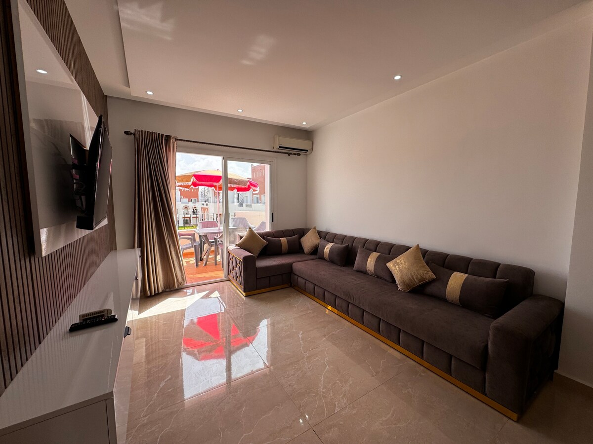 Super air-conditioned apartment in a private residence with swimming pool, security and free parking. The apartment has two facades, is bright and spacious facing the sea, and is composed of two bedrooms, 2 living rooms, 2 bathrooms, 2 balconies and located on the 1st floor. The large balcony equipped with table and chairs, with an unobstructed view of the garden and with a moderate view of the pool and a balcony with a table overlooking the garden. The apartment is located around Marjane Market and Golf, aqua park and 2 minutes from the beach