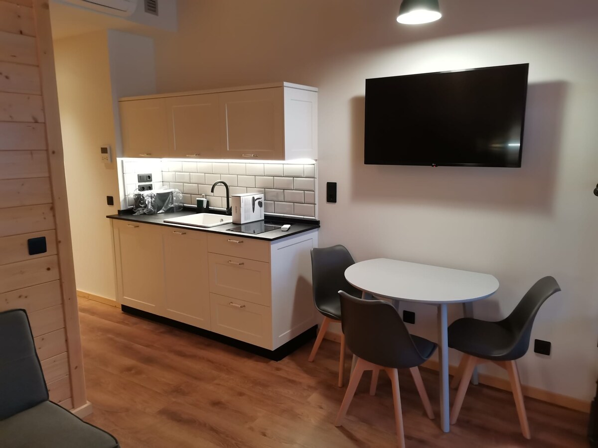 Villa Natalia is a modern 45 m² loft, with everything located in a single open space except, naturally, the bathroom. Outside, a 200 m² enclosed patio with stone walls, a garden, and a gazebo surrounded by forests and meadows complements the interior, providing the perfect setting to spend peaceful afternoons and enjoy breakfast, lunch, or dinner outdoors in a relaxed, rural atmosphere, fully in harmony with nature.