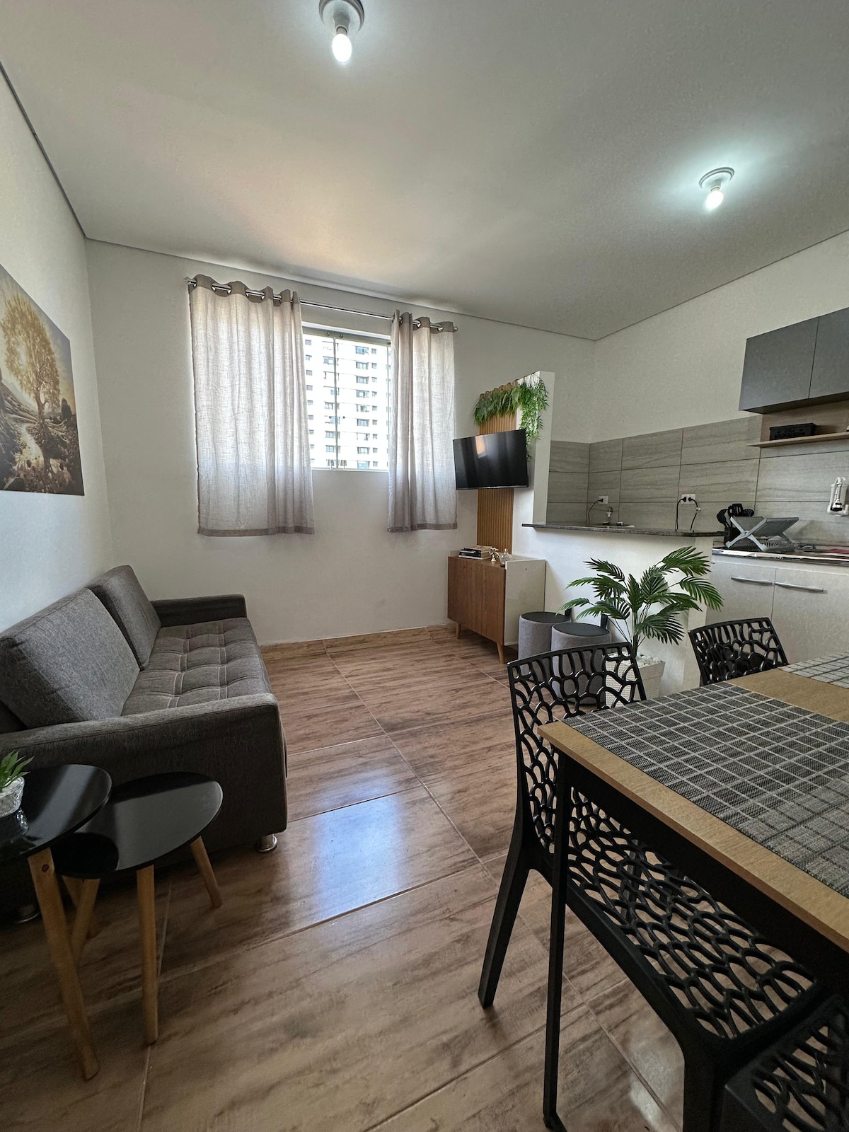 Executive Flat in Osasco, near Alphaville → 32m² flat → Self check-in → Bed and bath linen provided → Smart TV with Netflix → Air conditioning → Kitchen: minibar, Nespresso machine, air fryer, microwave, cooktop, sandwich maker, blender, wine glasses, utensils, dining table, and bar counter → Ideal for business travelers: fiber-optic internet, desk, ergonomic chair, monitor → Swimming pool, gym, and laundry facilities → Parking not included in the stay - R$20 day (˜USD4)