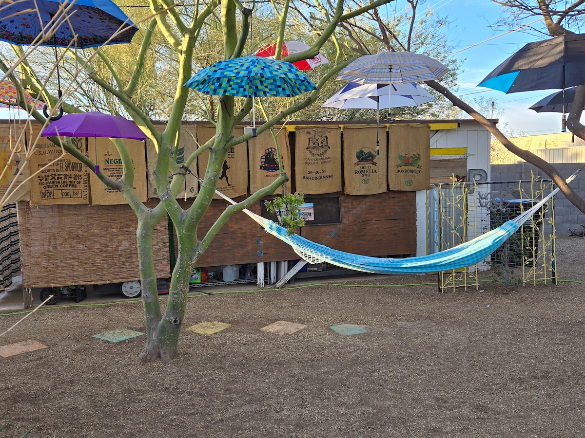 Welcome to your private casita (tiny home) in the heart of Midtown. Located right across the street from Starbucks, Buffalo Exchange, and the famous Taco Guild, relax comfortably with vaulted ceilings, a spacious layout, outdoor patio, and a quiet bedroom with a Queen-size bed — perfect for solo travelers or couples. Plus, the Light Rail station is walkable, which goes to Uptown, Downtown, the airport, Tempe, and Mesa. You are only: 7 mins to Downtown 9 mins to the Airport 15 mins to Scottsdale