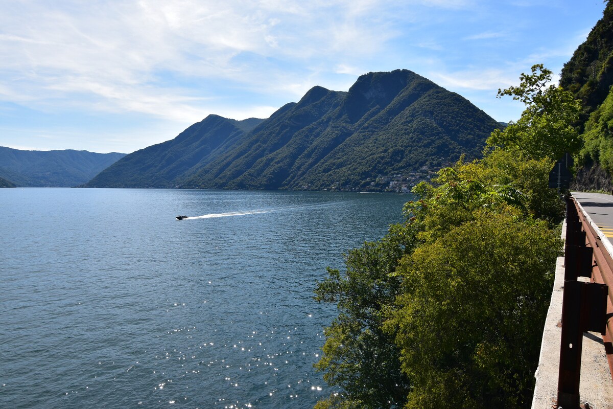 A scenic view of Lake Como is visible from the balcony, featuring calm waters and lush green mountains in the distance. Boats are docked at the marina, adding to the tranquil atmosphere. Soft natural light enhances the beauty of the landscape.
