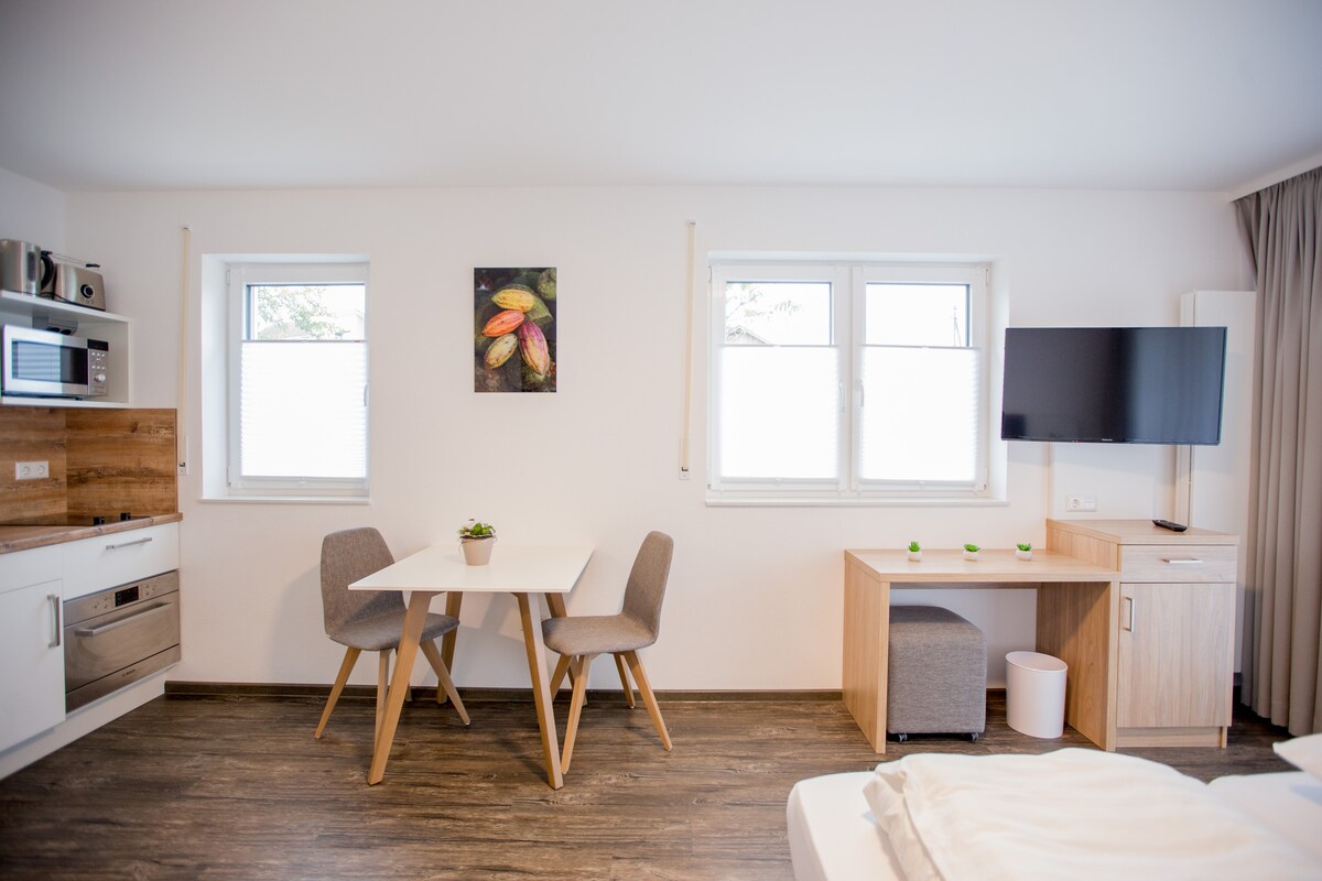 Feel free to ask us for offers for longer stays! Modern, fully equipped apartments directly above our chocolate factory. Our apartments are semi-serviced. What does that mean? - Basically, they are self-catering apartments - Once a week included: cleaning of surfaces in the kitchen & bathroom as well as towel change - 1x per month included: change of bed linen (for correspondingly longer-term bookings) Central laundry room with washing machine & dryer (additional charge)